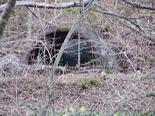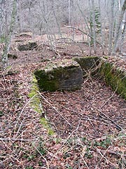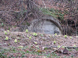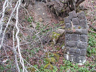 坑口の一部がわずかに確認できる大祥内坑(写真左)とその巻座(写真右)。この箇所は何とか川を渡ることができました。しかしながら林道は平成18年の5月初旬にはこの先崩れている場所があり、さらなる奥地の探索はあきらめざるおえませんでした。