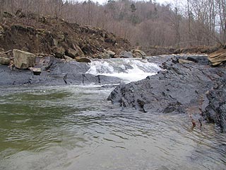 川に炭層が露出し黒ずんだ川床になっています。