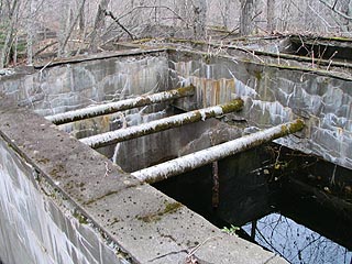 舌辛川を遡って林道をはしっていくと様々な施設を発見することができます。そのひとつが大曲の水道施設。どのような構造になっているかは残念ながら理解できませんでしたが写真左は沈砂池、写真右は沈殿池もしくは濾過池と思われます。