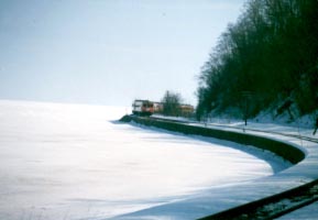■月見ヶ浜をはしるさようなら湧網号 氷に閉ざされたサロマ湖の月見ヶ浜の湖岸をはしる網走発のさようなら湧網号。 先頭車がキハ22というのも味があります。