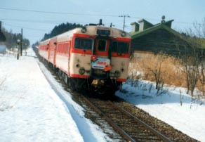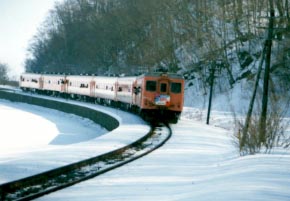 ■芭露駅に入線するさようなら湧網号 網走行きのさようなら湧網号が今度はキハ56を先頭に芭露駅に入線してきました。 3月にもかかわらず窓の幾つかは開けられ必死にビデオ撮影する人の姿もありました。