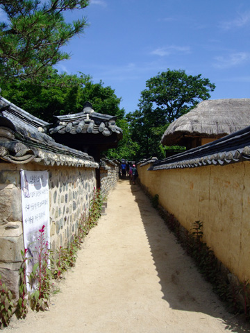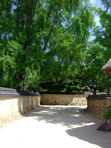 | 土壁通りを撮ってみました。両班が左、カラブ家が右とハッキリ分かります。石を積んで見せているからといって下層ではないというのが分かりました。結構趣味の世界かもしれません。 | もう一つ土壁とストリート。緑が入るとこんなにも美しくなるのが素晴らしい。その緑のボリュームに合わせた訳でも無いでしょうが、ここは街路が広かった。 | ||||||||||||||