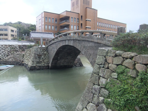 | 教会建立時の写真が飾ってありました。大勢の信者の献金によってこの日を迎えることが出来たのです。日の丸が合っているような、無いような変な気分です。 | 市役所前にある幸橋。18世紀初頭の作で、オランダ商館を作った石工の技術を元に下とか。国の重要文化財に指定されています。長崎の眼鏡橋より美しいかも。 33 22 06.211,129 33 11.20 |