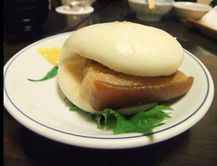 | 大名巻き。こんなお皿に盛りつけてきてくれました。おなかも段々一杯。 | 角といいながら頼んでしまった角煮おにぎり。そうかおにぎりにも入るんだ。 | 角煮まん。やっぱりこれでなくては。 | ||||||||||