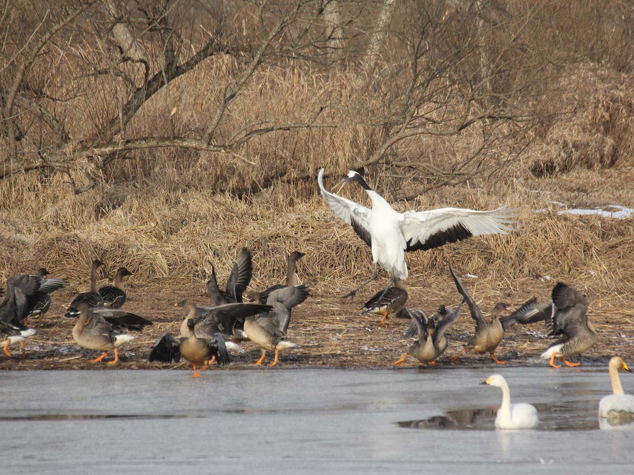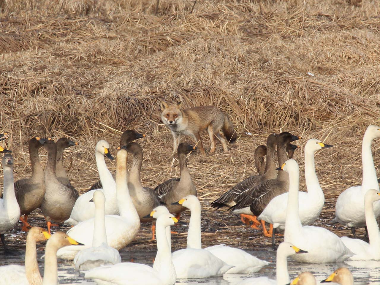 蕪栗沼の中にタンチョウがいました。凍った水面の上をキツネが歩いていて、驚いたタンチョウは周りのハクチョウやオオヒシクイにやつあたりして暴れていました。