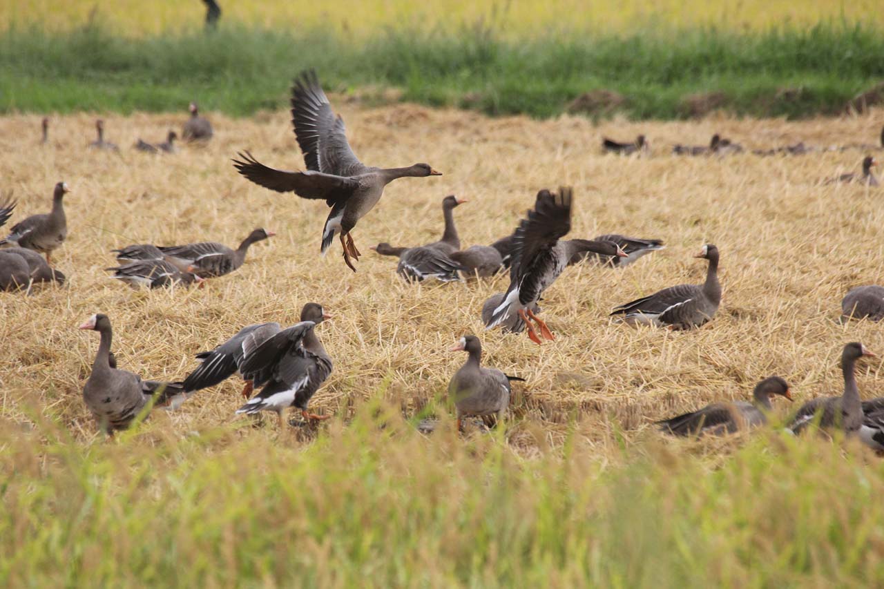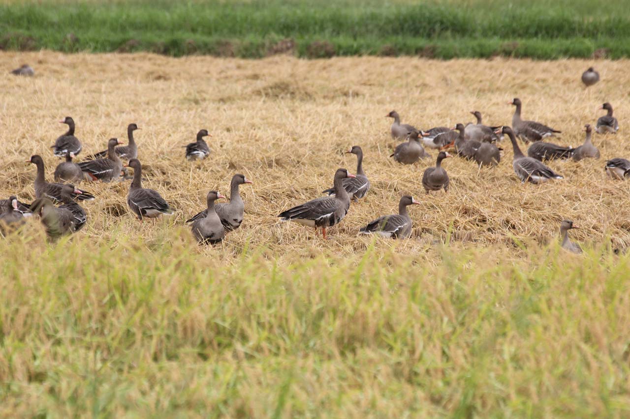 平成24年の夏はとても暑い日が9月20日頃まで続きましたが、マガンはいつもと同じ時期にやってきました。写真は24日の午後2時頃、栗原市瀬峰藤田の水田(蕪栗沼遊水地四分区)で撮影されたものです。