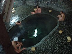 ![]() ■印象 帳場に挨拶すると日帰り入浴客にも丁寧に応えてくれる。教えられてさっそく有名な白猿(しろざる)の湯へ行く。廊下から覗き込むと地下2階程の深いところに小判型の浴槽がある。 男女別に浴室へ下る階段があるが、浴槽は混浴だ。階段を下りたところに衝立で隠した脱衣場所がある。かけ湯をしてさっそく入る。足のかかる所がなくてザブンと胸までお湯に浸かった。 聞いてはいたが思いのほか深くて驚いた。深さは1.25mある。白猿の湯の底はデコボコしている。透明で少し熱めの源泉そのままが底から湧き出している。泉質は含芒硝硫化水素単純泉だ。見上げると天井がたいへん高い。静かにしているととても気分がよい。