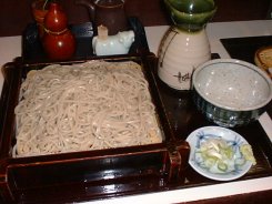 | ■手打ち蕎麦 越後湯沢では新潟名物のへぎ蕎麦が食べられる。へぎとはざる蕎麦のざるの代わりに使う大きなすのこである。このすのこにきれいに3.4人前の蕎麦を小分けして並べる。今回は普通にせいろ蕎麦を食べた。 |