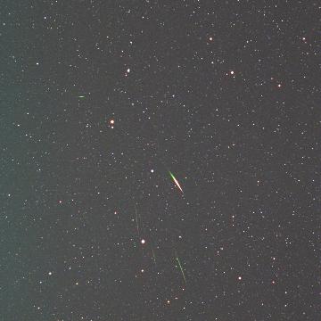 | 画像中央の星の集まりが、プレセペ星団。かに座の中心にある散開星団です。このそばを、下から上に、火球が流れました。色の変化は上と同じように見えます。 こちらも魚眼レンズをトリミングしています。かなり拡大しているので、少しぼんやりしましたが、火球の色は、よく分かります。 |