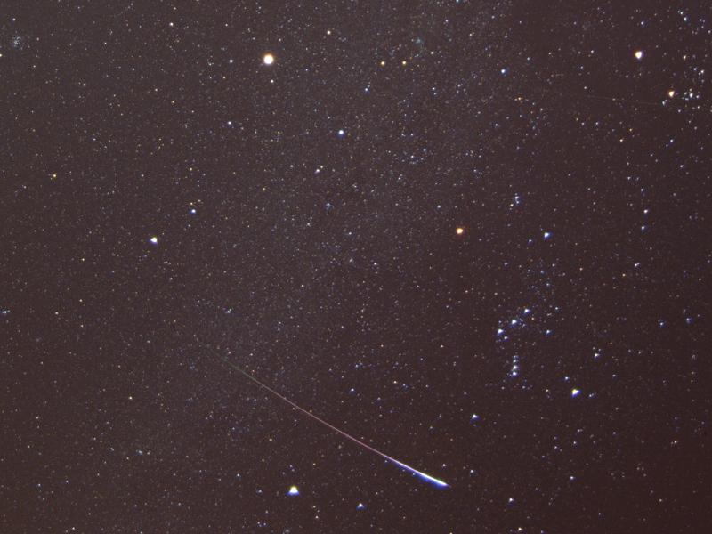 | 魚眼レンズを一部トリミングしたもので、星が変形し、流星が曲がってしまいました。画像右がオリオン座。下の明るい星が、おおいぬ座のシリウスです。上の明るい星が、木星。木星の右から、シリウスの左へと流れるのが、冬の天の川です。流星は、左 上から右下に流れました。緑色から赤に変化し、最後に爆発したように明るくなっています。このような流星が、火球と呼ばれるものです。今回のしし座流星群は、火球もたくさん見えました。 |
