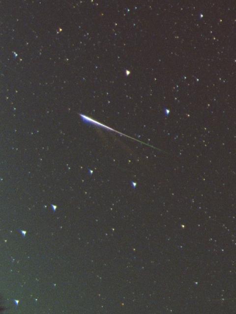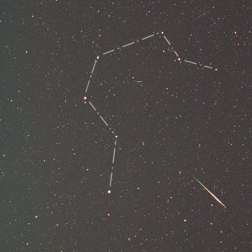 | 北斗七星を横切る姿です。右から左へ流れていきました。 流星をよく見ると、煙のようなものが下に伸びています。 これが流星痕(りゅうせいこん)と呼ばれるものです。 大気の流れによって、少しずつ変形して次第に見えなくなります。 |