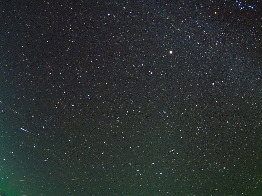 | こちらは、魚眼レンズで撮影したものを合成しました。画像の下に放射点があります。左端には北斗七星、右上の一番明るい星が木星です。魚眼レンズで撮影すると広い範囲が写るのですが、明るいものしか流星が写りません。標準に比べ少し寂しい感じがします。 |
