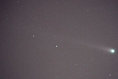 | 2日前より条件がよく、明るく長い尾が見えます。しかし、相変わらず低空の透明度が悪く、また光害のため、思ったほどうまく撮れません。3/4のダストの尾のように見えたものは、イオンの尾の明るい部分のようです。ただ、確実にコマの後ろが明るくなり、ダストの尾の感じが見えそうです。明るさは、4等台のようで、3cmのファインダ−でも良く見えました。 | 約1週間ぶりの姿です。ただ、低空の薄雲ともやがあり、薄明もてつだって露出時間がかなり短くなっています。そんな条件ですが、ダストの尾が左少し上に向かって曲がりながら伸びて、かなり様子が変化しています。透明度のせいかイオンの尾はほとんど分かりません。条件が同じではないのですが、コマの部分は2/24に比べ大変明るく感じ、ダストの尾が伸びたため、少し黄色くなっています。 |
