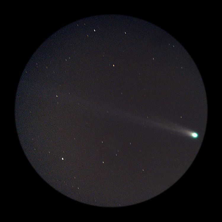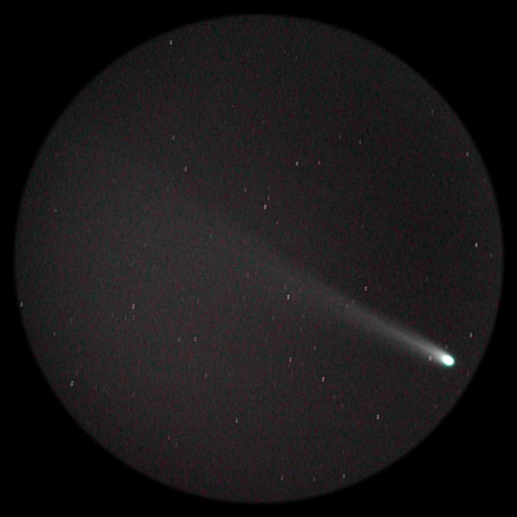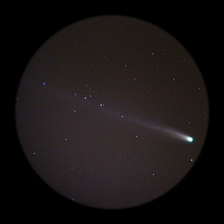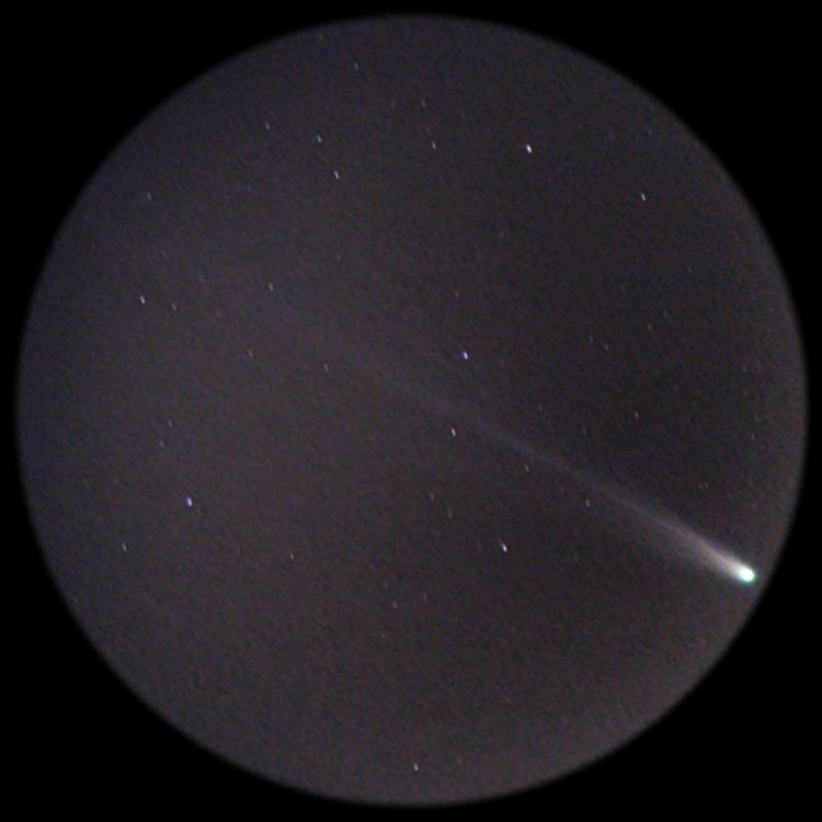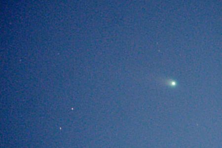 | この日も透明度に恵まれました。昨日より少し拡大率を落としました。視野の直径はおおよそ2度あります。視野いっぱいに尾が延び大変美しい姿です。7.5cm20倍でみると、コマがエメラルドグリ-ンに見え大変カラフルです。ただ尾の色は分かりません。彗星の方向はちょうど黄道光があり、また見かけの大きさが小さいので、肉眼ではその存在がはっきりしませんでした。明るさは、近くにある4.9等星より明らかに明るく見えました。 |