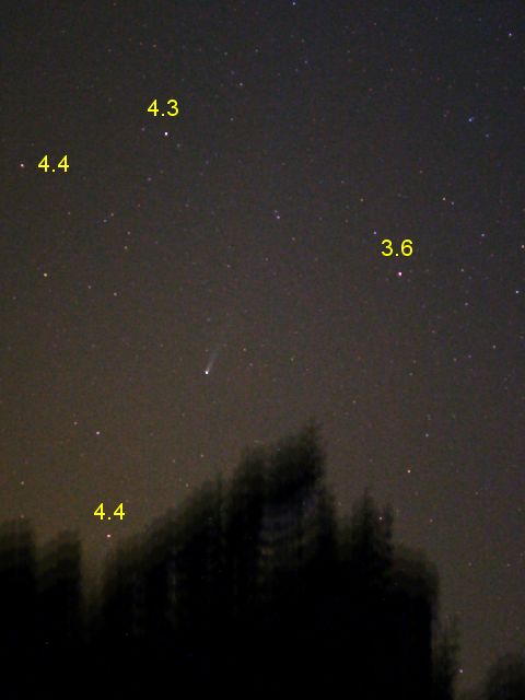 | デジカメ単体での姿です。周りの星の近くにある黄色の文字は、星の明るさです。3.6は3.6等星となります。星の色によって明るさが違って見えますが、おおよそ4等くらいです。右上に向かって細長い尾が伸び、大変かわいらしい姿です。 |