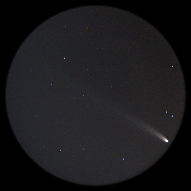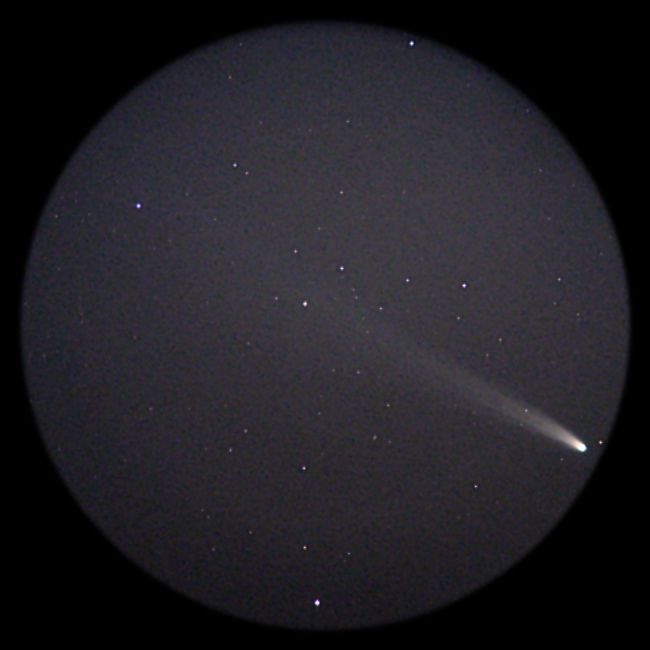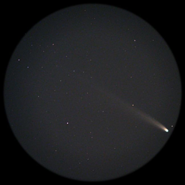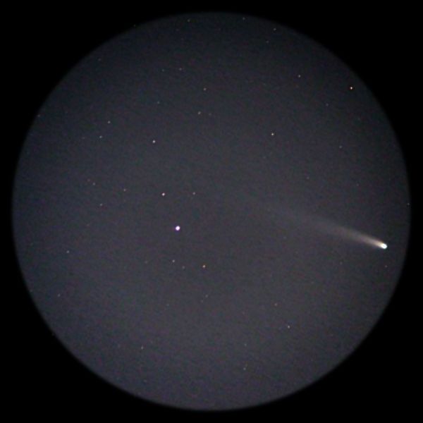 | 相変わらず黄砂ともやの影響があったのですが、日が沈むにつれ条件が少し回復し、昨日より見やすく肉眼でも良く分かりました。画像の下の星が3.6等星で、肉眼で見た感じはほとんど同じ明るさでした。 この画像の視野の直径が約3.5度ほどあるのですが、その視野を横切るように尾が見えています。おおよそ3度は分かりますが、さらに先にあるかもしれません。尾を良く見ると、左上に向かいながら、少し下よりにダストの黄色っぽい尾、少し上に向かいながら、青白いイオンの尾がかすかに見えます。ステラナビゲ−タ−で見ると、尾の長さが0.05天文単位、約600万キロあることが分かりました。 |