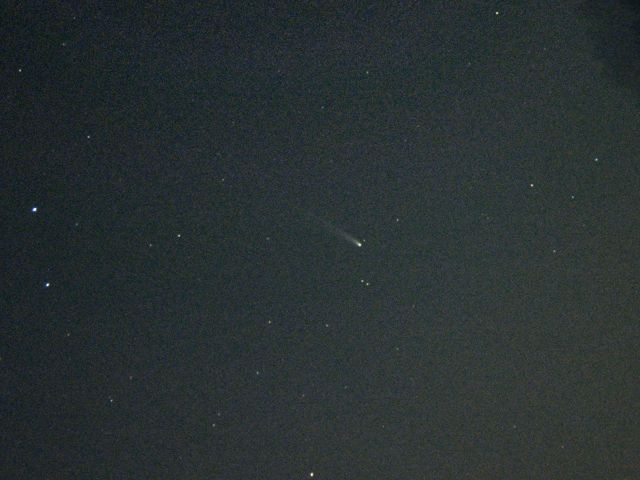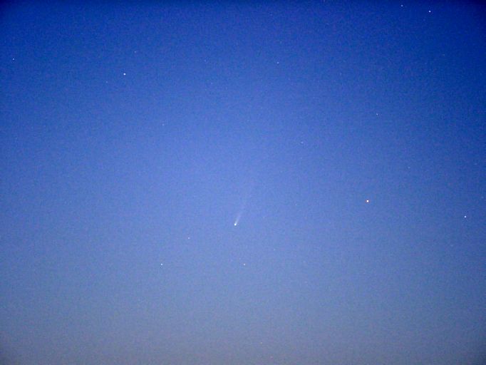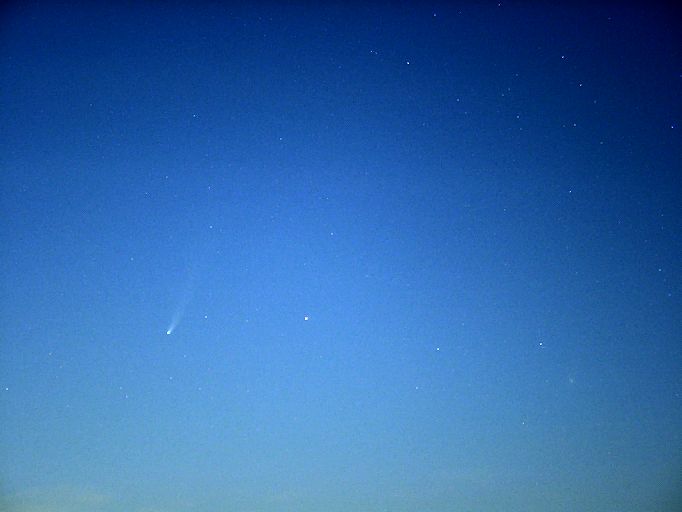| ほぼ1週間ぶりの姿です。東の空に、ほぼ満月の月があり空はたいへん明るく、低空のもやもあったため、夕焼けの残る中の撮影です。 相変わらず尾がよく分かり、とくにダストの尾が明るく見えます。またかすかですが、イオンの尾もまっすぐ上に伸びているようです。ただ月の明るさが影響し、肉眼ではよく分かりませんでした。しかし、7x42の双眼鏡では、尾も分かりました。 デジカメ単体の画像で、35mmレンズ換算で100mmのものです。もう中望遠レンズでないと、尾の全体の姿が入らないように長くなってきているようです。 |