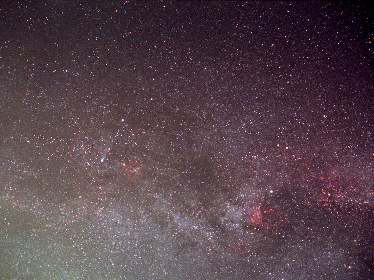 | 30分ほどの晴れ間があり、久々に撮影できました。地球に近づき、コマが大きくなり肉眼でよく分かりました。しかし、尾が淡くなり、特にダストの尾が少なく、見にくくなっています。7x42の双眼鏡では、尾が淡くどこまで伸びているのか分かりませんが、写真では、かなり伸びているようです。 このあたりは、天の川の近くでバックの星が多く、たいへんにぎやかです。しかし、絞り開放で撮ったため周辺減光が起こり、中央だけ天の川が目立ってしまいました。そして、このあたりの尾は、天の川に隠され、はっきりしません。天の川をぬけると、もう少し分かりやすくなるでしょう。 |