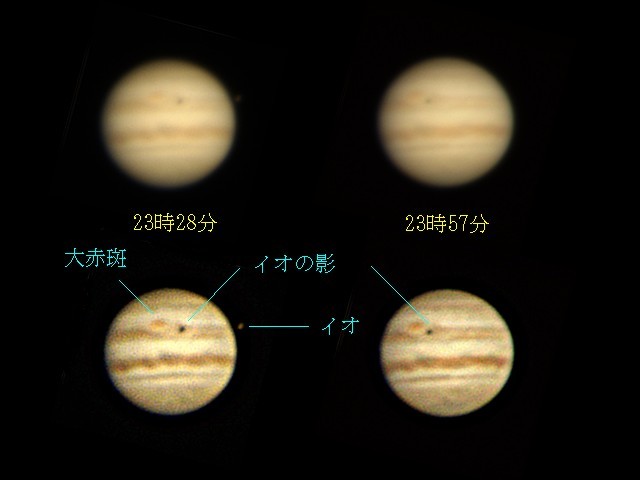 23時28分の画像を見ると、木星の右側にあります。この時、太陽の光は木星の右側にありますので、木星面にイオの影が投影されています。23時57分の画像は、イオが木星と重なり分からなくなりました。しかし、イオの影からイオの位置を想像することができるでしょう。