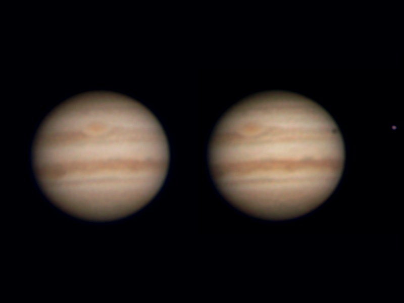 この時は、太陽の光が木星の右側からあたっているので、左側にずれて木星面にイオの影が投影されています。