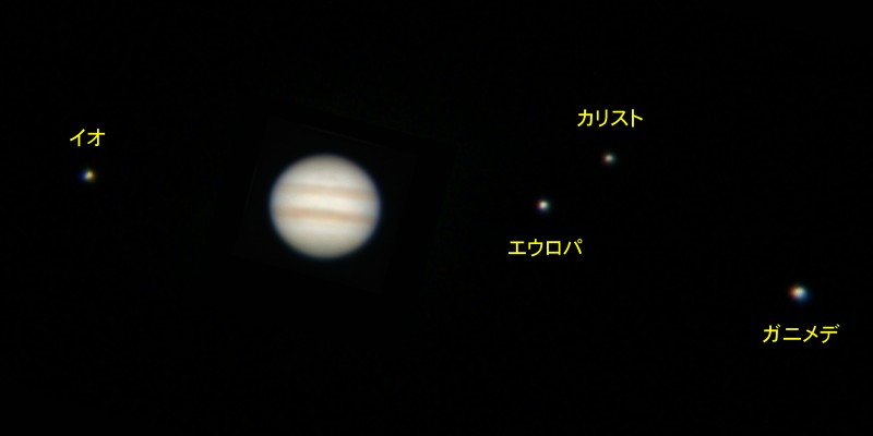 なおこの画像はガリレオ衛星と木星をそれぞれ露出を変え合成しています。衛星の明るさにあわせると、木星は真っ白になってしまったからです。これが写真の難しいところです。