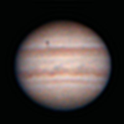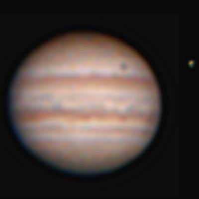 木星の右側に見えるのが、衛星のエウロパです。そして、木星本体に右上のほくろのようなものがエウロパの影です。太陽の光が右側からあたり、エウロパによって木星表面に影がうつっているのです。