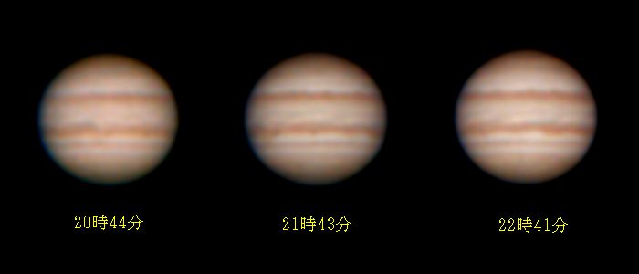 | 木星の自転は約10時間です。地球は、1日が24時間ですから、木星で考えると1日が、約10時間と言うことになります。このように、木星の自転速度が速いため、望遠鏡で見ていると、表面の模様が動いていくのがよく分かります。上の写真は、ほぼ1時間おきの木星の様子です。写真の上が南極方向のあたり、南極方向から見て時計の針と同じ方向に回っています。太目の縞模様に注目すると、模様が右から左に動いているのが分かるでしょう。 なお、この写真は3つの木星を比べやすくするため、通常サイズの半分の大きさにしています。また、惑星の写真は、一般的に南を上にすることが多く、このペ-ジのすべての惑星は、南を上にして掲載しています。 |