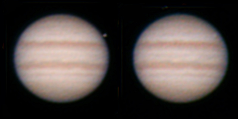 | 上の画像は、11/5の木星とその第二衛星エウロパの動きです。23時43分、エウロパは、木星のすぐ右上に見えています。この時、木星より暗く感じます。しかし、その17分後、24時には木星と重なり、木星に右上に光点として見えています。これは、木星のふちの明るさよりも明るいため、光点として見えるのです。しかし、木星中心付近まで移動すると、木星の明るさとエウロパの明るさがほとんど同じくらになるため、見失いそうになります。これは、木星がガスで出来ているため中心部分が明るく、周辺にいくほど暗くなっているためです。このように、木星の表面を移動していく衛星を見ていると、輝きが変化するよう見え、たいへん興味深くなります。 |