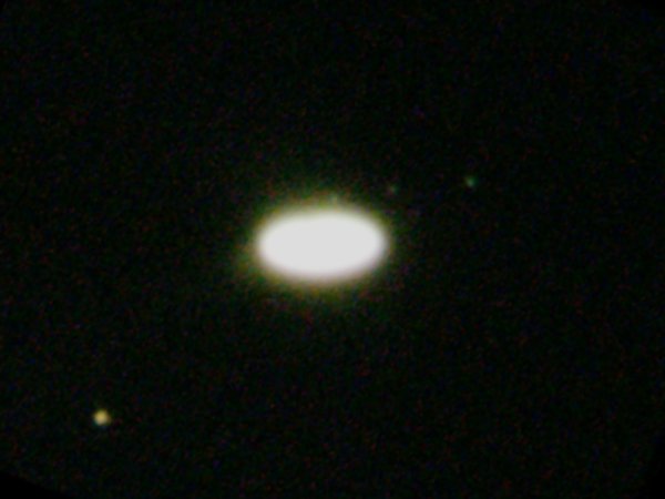 中心の円盤状に輝く明るいものが土星本体です。衛星は暗いので、衛星に露出をあわせると本体はオ−バ−になってしまいます。画像の左下が、最大の衛星チタンです。土星の上側には、3つ衛星が写っています。チタンは8等で明るいのですが、他の3つは10等以下のためあまりはっきり分かりません。ただ、条件に恵まれれば、土星の衛星は5〜6個見えることもあります。 2000年9月19日 0時30分 20cmシュミカセ+LV9mm+QV3000EXで1秒露出、ZOOMは最も広角側