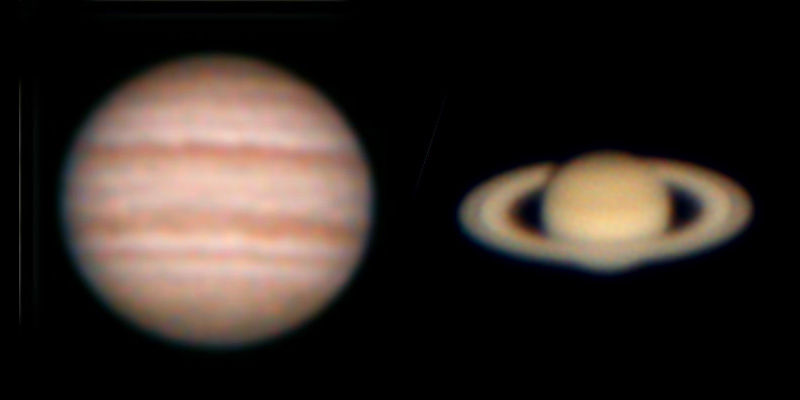 木星は、太陽系最大の惑星です。その大きさは、地球の約11倍。土星は、2番目に大きく、地球の約9.5倍。環を含めると、木星よりももっと大きな惑星となります。しかし、写真で見比べると、土星がずいぶん小さく見えます。これは、地球からの距離の違いによるものです。おおよそ、土星は木星の約2倍の距離にあるのです。土星が、木星と同じ距離にあれば、もっと大きく見えるはずです。