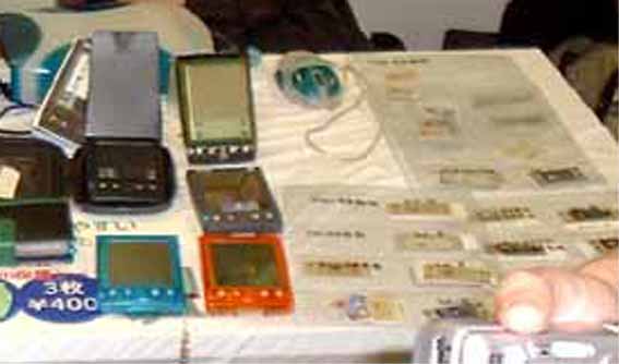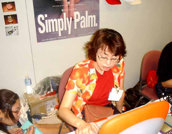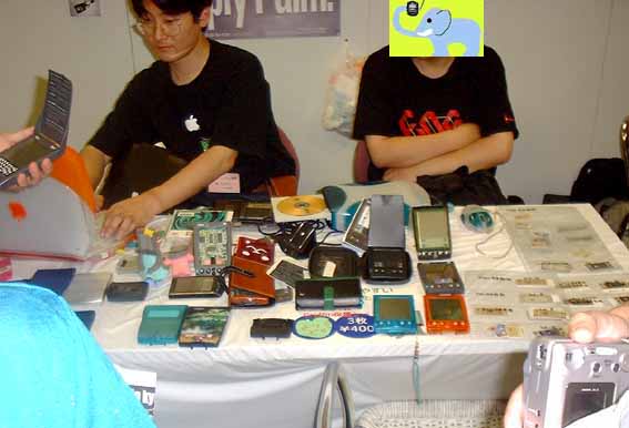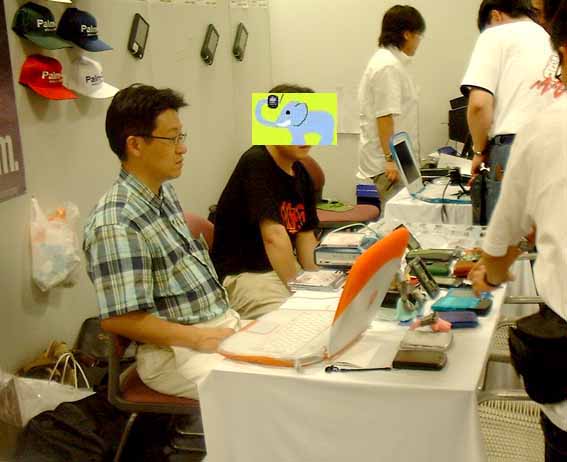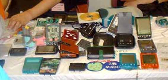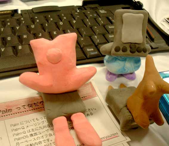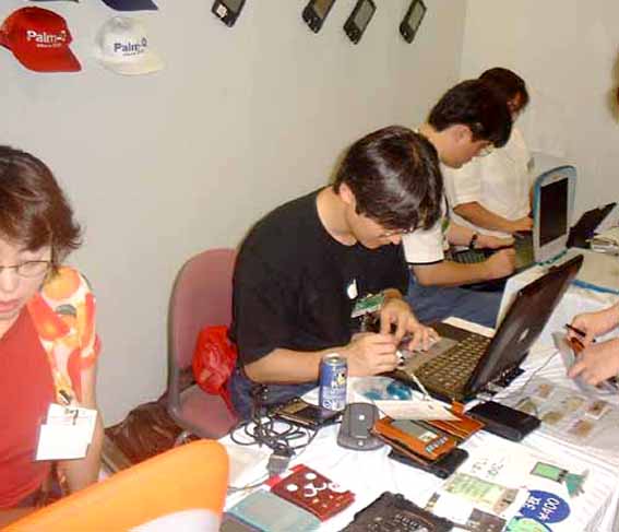 | なにやらうち合わせ中 | 展示された様々なパーム機と周辺機器。一つも素のやつがないのはなぜ?右端が三橋先生制作のグラフィティエリア保護シート |