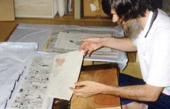 Once this was all done, moistening the paper had begun, and this was the 'point of no return'. Once the process has started the paper must remain at a constant level of moisture right until the end of the printing, and as damp washi that has been treated with a gelatin sizing is a perfect breeding ground for molds, producing a batch of prints is a race against time. Once the moistening has begun, nothing must be allowed to interfere with the work; invitations from friends and collectors must be met with "I'm sorry, but the printing has started ... I won't be able to join you today ..."