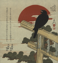 The most common type of surimono (the term translates simply as 'printed thing') were prints like the one you see illustrated here, containing a blend of image and poetry, usually of the kyoka type. Such prints were commissioned by the poets themselves, and were exchanged among the members of their poetry 'circle'. Because no commercial motives were involved, purely artistic factors were allowed to dominate economics in their manufacture. The finest papers and pigments were used, top rank craftsmen were commissioned to do the carving and printing, and the best artists were asked to produce the designs. Surimono were usually fairly small in size, with 19 x 21.5 cm being the most common dimension.