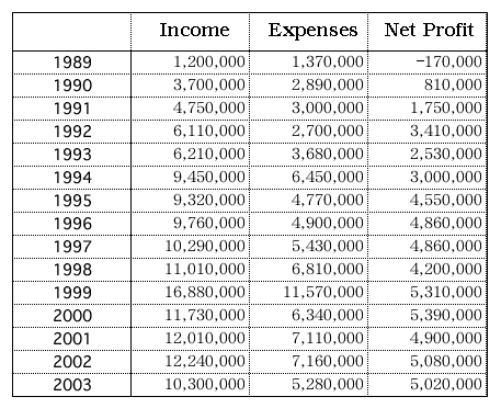 Together with this story are three tables/graphs. The first one shows the 'big picture' - the overall income/expenses in yen for the fifteen-year period (to get a rough approximation of $, just knock off two zeros from the end of each figure).