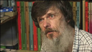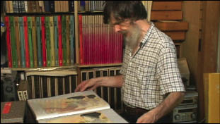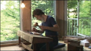 [Camera: as titles roll ...] Back at the carving scene in the workshop. David seems to come to the end of a particular section of the work; he puts down his tool, straightens things up a bit, and gets up from the bench. Cut to outside: view of the river, but at one side of the screen, David comes out of the workshop door, and heads upstairs. Cut to room upstairs: Dave comes in, goes to the print storage shelves, pulls a folder out, sits down, and shows it to us ...