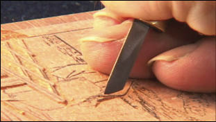 [David (voice over)] "I can hear - as well as feel - when the blade needs sharpening; the knife starts to tear its way through the wood instead of slicing. It is vitally important to keep it as sharp as possible. Many of the carved lines in my prints are extremely fine; if the knife is too dull, the edge of the wood becomes slightly torn, allowing water to enter during the printing stage. The printed lines lose their delicate character ..."