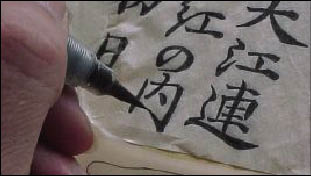 [David (voice over)] [Camera continues to show the tracing work, along with interspersed shots that match his comments] "In the old days, the master copy of the design that would be used to guide the carving - the hanshita - would have been prepared by a specialist craftsman, one highly skilled in using the traditional brush. He took the design supplied by the artist, which was sometimes in very rough sketch form, and 'translated' it into something with clearly defined lines more suitable for carving.