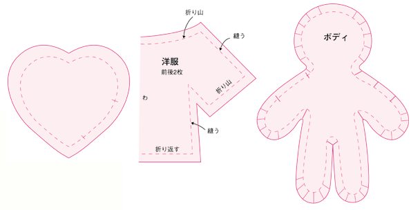 ドア飾りの作り方 型紙を作り、2枚の布を合わせて鉛筆でかたどります。返し口を開けて、周囲を細かい針目で縫います。 |