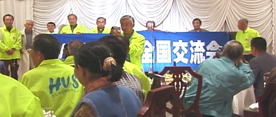 会は進み、JVA全国交流会の旗が来年の開催地「福井県」の西川一郎さん、小坂勝治さん、相磯勇さんに手渡され、「よーし、来年は福井で会おう」の声。