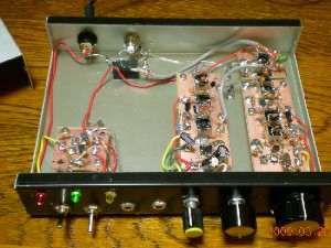 「本」の製作事例では電源コントロール部は受信部と送信部の基板に分かれていますが、わかりやすくするため纏めました。実際にキーを入れて切り替わるかテストしてみると、うまく切り替わり送信、受信のインジケータの発光ダイオードが交互に光り、完成です。 次に「受信部」を作ります。VXO部より回路が単純なので比較的楽です。後日386のパワーアンプを配線してケースに収める予定です。 問題はVXOの出力が144.02MHzから144.052MHzの範囲なので完成した場合、この周波数付近で出てくる局は極めて少ないので交信どころか受信すらできないのではないかと云う点です。 周波数が高くなると出力は弱くなることが確認できているので、多少発信回路の定数を変えてもこの水晶でこれ以上高い周波数は無理のみたいです。水晶を変えるのが簡単かつ確実な方法ですが、安い出来合のものがないようなのでメーカーに特注するしかありませんが高くなります、どうしよう。 (2009/03/23) ![]()