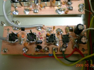 VXO部を配線しますが、三次元的な配線で何か悪い配線の例に出される所謂「もやし配線」になっています、こんなんで大丈夫かなと不安になります。(2009/3/12)このVXO部をケースに取り付け、ボリュームやトグルスイッチなどに必要な配線をします。これも一部空中配線になっています。 いよいよ電源を入れて調整に入ります。まずRFプローブを当てて発振を確認しますが、「アレ」発振していないコイルのコアを回してみますが全く反応無し、各部の電圧を測ってみますが異常はないみたい、各ランドへのRやCの取り付けも間違っていない。 念のため発振段の2SC1906の取り付けを確認するとなんとベースとエミッタが逆になっていると言う単純ミスでした。早速付け直しをしましたがそこはランド方式のいいとこで、すこぶる簡単にできました。 発振が確認できたので、今度は周波数カウンターでいよいよ調整です。18.0MHzの水晶を使っていますが基本波の範囲は18.00347MHzから18.00652MHzで3KHz程度動いています。RFプローブを当てながら10S50のコイルを調整してピークを取りましたが、周波数は54MHz台でこれでは3逓倍です、さらにコイルを調整すると72MHz台になり一安心。 2段目のコイルを調整すると144MHz台が出てはきましたが、RFプローブの出力は一段目と比べると極端に低い十分同調してない様子、多分浮遊容量の関係で10S144に抱かしているコンデンサーが7ピコでは多すぎるのではないかと思いますので5ピコにして再度調整したいと思います 。(2009/03/13) 10S144に抱かしているコンデンサーを5ピコにしてみましたが、あまり変化ありません。10S144のコアをいじくり過ぎたのか、片方のコアが動かなくなってしまいました、コアを動かしても出力に対する反応が鈍いのでこのままで良いことにします。 電源コントロール部と受信部の基板の切り出しを行いました。次は電源コントロール部です。(2009/03/14) ![]()