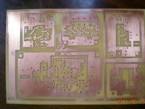 原図はA5(葉書サイズ)4枚分ですのでまずその一枚分を切り出し、A5版の感光基板に密着させクランプ板に挟みます。問題は露光時間です、露光機はサンハヤト「ちびライト」使いましたが、表示によると感光基板の製造後月数によって変わるとされ1年後では半透明フィルムで13分となっています。5年以上たったものですので見当もつきませんがこの13分で試す事にします。一見上手く露光できたように見えます。いよいよ現像、液温は35度少し高いかな、ところで時間はどのくらいだったけと説明書見ると一分以内です、大変だもう2分以上たっている、慌てて水洗いすると露光に反応して青色なった部分も
