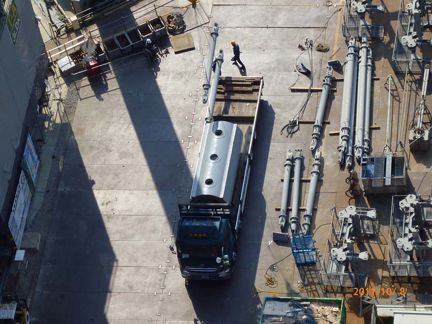 兄弟クレーンが部品を下ろし、搬出します。