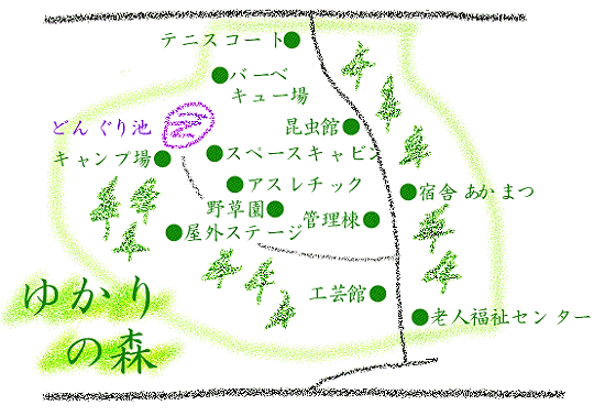 世界の昆虫が見られる昆虫館、陶芸や木工細工を体験できる工芸館、屋外ステージ、アスレチック、キャンプ場、宿舎あかまつなど楽しい施設がいっぱいです