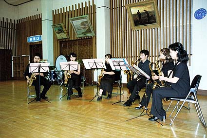 まず最初のグループ、サクソフォーンアンサンブルです。曲はオッフェンバック作曲、アール・ガイ編曲「オルフェウス オーバーチュア」。アルト3本、テナー2本、バリトン1本の編成での演奏です。今回のサックスのメンバーは意欲的で当初から難曲を希望しており、それならばと引っ張りだしてきた作品です。練習も精力的にやり、1ヶ月前の内輪のコンサートでは、アルトの横田くん、テナーの風間さんのがんばりが特に目をひきました。それから1ヶ月、バリトンの小沢くん、アルトの永渕・桜庭さんらがさらに磨きをかけてアンサンブルを作っていきました。後の方になりましたが、テナーの山端さんも入り、響きに厚さを加えてくれました。それぞれ、個人的な技術を大幅に上回るだけの練習量で作品を見事に演奏してくれました。最後の重厚な響きなどは、土日返上で練習してきたからこその出来栄えと言っても過言ではありません。そんな演奏でした。演奏終了後、各楽器を簡単に紹介してから、グループリーダーのハッピーなお知らせ(今度結婚するんだそうです)。これで会場が和やかな雰囲気になりました。