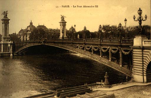アレクサンドル3世ってロシアの皇帝らしい。どうしてロシア皇帝の名前をつけたのか知らないけど、とにかく、1900年のパリ万博のために作ったらしい。アンヴァリッドからずっと歩いていくとこの橋に出て、橋を渡ると、両側にグラン・パレとプチ・パレがある。さらに歩くとシャンゼリゼ通りとぶつかる。これはアンヴァリッド側から見た絵。向こうにプチ・パレが見える。プチパレも1900年の万博用に建てられたものだ。BR>