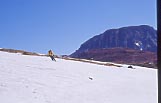 しばらく進むと大きな雪田が広がっている。ここで滑らなければどこで、、とス
