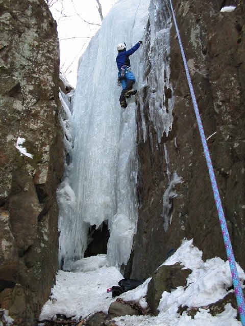 伊藤ちゅうです。 2/8土曜日、晴。 荒船山の北側、神津牧場至近のヤエグロ沢/インディアンサマー広場へ行ってきまし た。 求人広告の効果がでないので、ICEはどうもなあ~っていうけんじさんに、いつも のように無理を承知でビレイをお願いしました。 ここは、何年か前に岳人の贋トポ片手に辿り着けないクライマーが続出した、有名? なエリアです。 僕らもしっかりだまされましたが、なんとか解決。 でも、そのときはすでに日が傾きかけていました。 気温がどっとゆるんだせいか、 一番興味のあった氷柱、シャイアン、アパッチ(25mのバーチカル)はいづれも、 上部が崩壊したようで、やや貧弱。 核心の抜け口当たりか、下地の岩が見えている状態で水がシャワーになって飛び散っ ています。 最近のクライマーなら登るのかな? でも僕の感覚では、迷わず”取付いちゃダメ”って答えの返ってくる出来でした。 これはでも、しっかり凍れば、大同心や南沢より上だと予想できます?う~~~~、 燃える!) もうちょっと早く来た方が良かったかも。 この広場(実に快適な広場です)に面して4本の氷壁がありますが、右端がチェロキー で、これも出来が悪く、前面シャーベットです。 ただ傾斜もないので興味なし。 左端にチムニーがあって、フランケが立派な氷柱になっていて、さすがにチムニーの 中なので良く凍っていました。 これがリトルインディアンで、実質20m弱ですが、取付きからの10mがリアル・ バーチカルで、南沢よりも+1ランクと感じました。 見た目よりもつららの形状が複雑で、岩登り同様のムーブになるのが面白かったです ね。 落ちると反対側のカベに激突するかもしれないって感じで、結構びびりましたけど。 4時をもう回っていましたので、これ1本で、今回はおしまい。 神津牧場(車を牧場に置いてきました)までは、200mくらいの登りで、1時間弱。 ってことは来るときは下りなので、迷わなければ30分なんですが、いまでは、沢の 入口まで林道をたどれるのでもっと短縮できます。 ってことがあとで分かったのでした。 ただし、沢へ下る踏み跡は、つるつる混じりで相当急ですので要注意。 以上