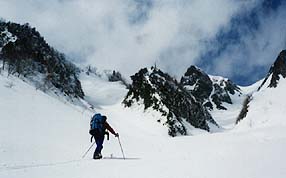 1992年3月20日 加藤 雅昭(大阪あすなろ山岳会) 秋田 三枝子(関西蛍雪山岳会) 原 伸 也(ビルエバンス同人) 92年の正月に大渚山の登頂した時に、雨飾山の左肩から「く」の字形に落ちて るルンゼが目についた。 正面から見ると傾斜は概して強く見え、スキー滑降ではとても不可能に見えた。 しかし眺めているうちに、それも可能であるかもしれないとおもえてきて 3月の連休に実行した。 3月20日 小谷温泉を7時30分出発。 林道を少し歩き、シールをつけて登高。 標高1127m地点から大海川沿いに登り、さらに夏道のある尾根の手前の沢を 登る。 荒管沢をトラバースし、右手の尾根に取り付く。 すぐにアイゼンに履き替え、クレバスの多い尾根を登る。 雨飾山の頂上に12時55分着。 山頂から、痩せた西尾根を慎重に下り、1860メートル地点からスキーをつけ る。 左ルンゼをのぞくと、だいたいの全容が見える。 岩壁や滝はなさそうで一安心。 雪屁の小さい部分から左ルンゼに滑り込む。 昼間部までは30~40度の急斜面。ジャンプウエーデルンで滑降。 気温も上がり湿雪になってるので、雪崩が心配だった。 巨大な前沢奥壁を回りこみ右ルンゼと合流すると斜度も落ち、20度程度にな る。 さらに前沢右俣は右に曲がっていて、ここからはデブリが多く滑りづらい。 1000m地点まで滑降しそこからシールをつける。 前沢の左岸を巻いてトラバース。湯峠に到着するころには日が暮れてしまった。 ヘッドランプの明かりに助けられ小谷温泉まで滑降。 19時30分小谷温泉着。 写真 1)大渚山から雨飾山の全景 前沢が見える 2)登りの写真 モデルはワシ
