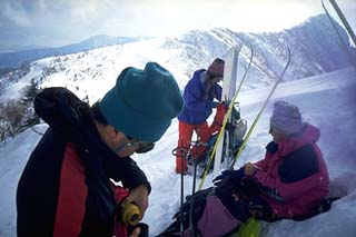 1994-2-4.5 メンバー 北田紘一 せいすけ、みぞべ、ケイ郎、森光、ひろゆき、汽車 深夜の雪中ドライブでようやく戸隠大橋につく。仮眠。めをさませば打ち合わせどう り、全員がそろっていた。 サド山と地蔵山のコル1678メートルを越え、氷沢にくだる。川をくだり、乙妻山北面 の大きな沢にはいる。雪の深いところをさがして、雪洞をほる。宴会。 翌日。頂上までいっきにのぼる。標高差700くらい。2、3日まえにでた大雪崩のデ ブリがある。ここは気をつけないといけない。頂上からは往路を滑る。けっこうな急 斜面。氷沢にでて、コルへの登りかえし。長くかんじる。 そのあとは下る一方。 くたびれたので、戸隠の民宿で酒盛りしました。